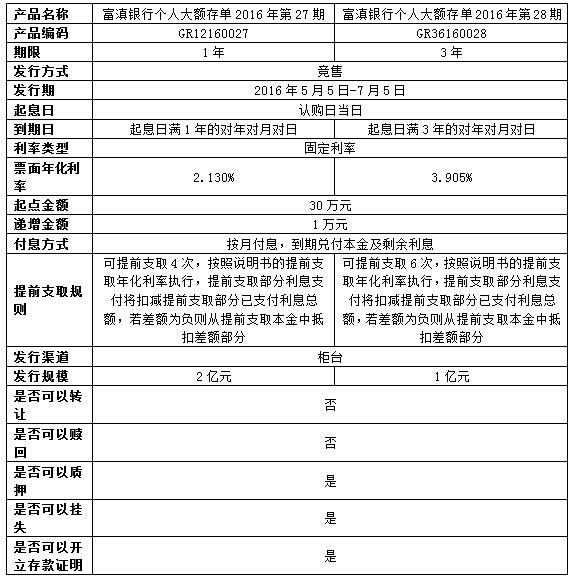 我行定于2016年5月5日至7月5日發(fā)行個人大額存單2016年第27、28期產(chǎn)品,產(chǎn)品具體信息如下: