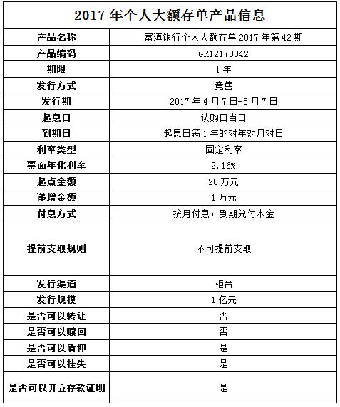 我行定于2017年4月7日至5月7日發(fā)行個人大額存單2017年第42期產(chǎn)品,產(chǎn)品具體信息如下: