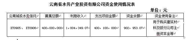 截至本報告期末,云南省水務(wù)產(chǎn)業(yè)投資有限公司(以下簡稱“云南水投”)共計使用本信托(云南城投水務(wù)信托”Ⅰ號產(chǎn)品和云南城投水務(wù)信托”II號產(chǎn)品)資金400,100,000元(人民幣肆億零壹拾萬元整)。